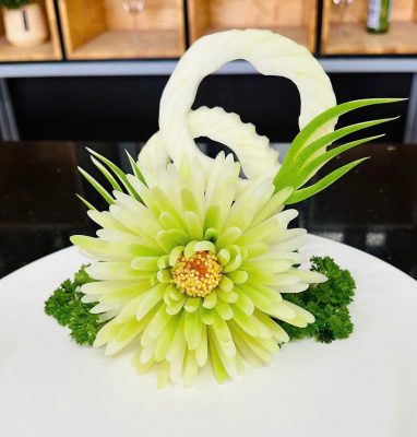 Từ những củ cà rốt bình dị, trái ớt đỏ rực, đến quả dưa hấu xanh thẫm, tất cả đều có thể được “thổi hồn” thành hoa sen, chim công, hay rồng phượng sống động qua đôi tay khéo léo của người nghệ nhân cắt tỉa. Mỗi đường dao không chỉ đòi hỏi kỹ thuật chính xác, mà còn cần con mắt thẩm mỹ, tư duy nghệ thuật, và cả tình yêu với nghề.