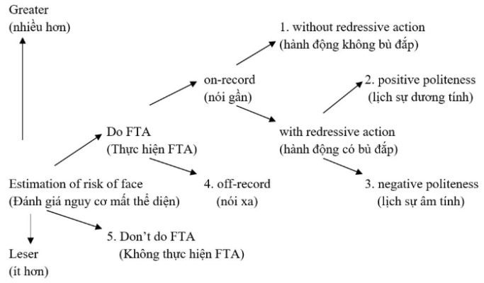 Công thức này được hiểu như sau: W (Weighting of a face threatening act) là mức độ đe doạ thể diện mà hành động nói của người nói đe doạ thể diện của các nhân vật hội thoại. Mức độ đe doạ này tuỳ thuộc vào ba yếu tố: (i) quyền uy (Power – P) so sánh giữa người nói và người nghe; (ii) khoảng cách thân – sơ (Distance – D) giữa người nói và người nghe; (iii) mức độ áp đặt của hành động nói (Ranking of imposition – R) trong nền văn hoá của cả người nói và người nghe. Nếu khoảng cách giữa người nói và người nghe càng lớn, người nghe càng có nhiều quyền uy đối với người nói. Do vậy, một hành vi như thỉnh cầu chẳng hạn càng được xem là có tính áp đặt trong nền văn hoá của cả người nói và người nghe, thì người nghe càng thiên về lựa chọn một chiến lược như chiến lược nói gián tiếp hoặc im lặng để không gây ra sự đe doạ thể diện của cả người nói và người nghe. Theo Brown & Levinson, lịch sự là chiến lược nhằm giảm thiểu mức độ mất thể diện đã hoặc sẽ xảy ra trong hoạt động giao tiếp của con người. Các nhà nghiên cứu này đã đề xuất các chiến lược và tiểu chiến lược được coi là phổ quát sau: (i) nói không bù đắp (without redressive action); (ii) lịch sự dương tính; (iii) lịch sự âm tính; (iv) nói gián tiếp/nói xa (off-record);(v) không thực hiện FTA. Sau đây là sơ đồ của Brown & Levinson về quá trình lựa chọn chiến lược giao tiếp:
