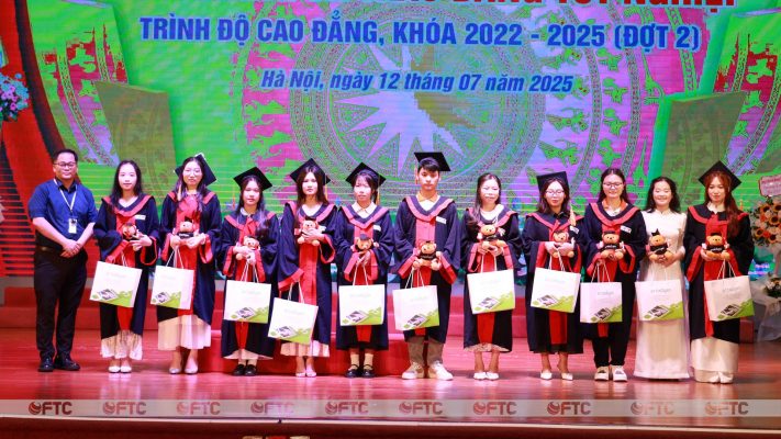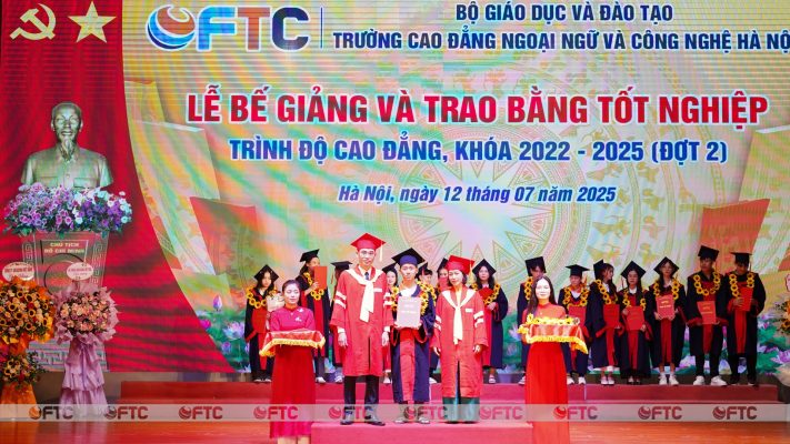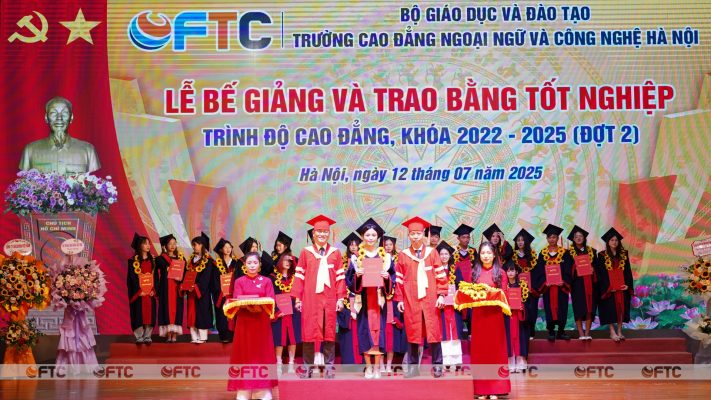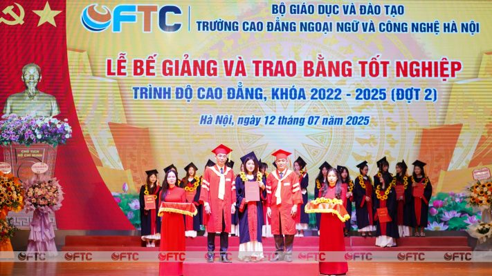Phần công bố các Quyết định công nhận tốt nghiệp và trao bằng tốt nghiệp cho các sinh viên đủ điều kiện tốt nghiệp đợt tháng 7/2025 và Quyết định khen thưởng sinh viên có thành tích Tốt nghiệp loại Xuất sắc và sinh viên có điểm tốt nghiệp loại Giỏi cao nhất của các ngành, trình độ cao đẳng, khóa 2022- 2025 xét đợt tháng 7 năm 2025, nhận được sự quan tâm đặc biệt của đại biểu, thầy, cô và các em sinh viên. Lần lượt 25 sinh viên có thành tích “Tốt nghiệp loại Xuất sắc” và 35 sinh viên có thành tích đạt điểm “Tốt nghiệp loại Giỏi” có điểm trung bình chung tích lũy cao nhất các ngành lên sân khấu nhận giấy khen và phần thưởng trong tiếng vỗ tay không ngớt. Những gương mặt rạng ngời, tự tin trên sân khấu là những đại diện xuất sắc cho sinh viên Trường Cao đẳng Ngoại ngữ và Công nghệ Hà Nội “Lối sống đẹp – Học vấn rộng – Chuyên môn sâu – Kỹ năng co – Thành đạt sớm”. Trong số này, có những em đã hoàn thành thời gian thử việc trong 03 tháng thực tập tốt nghiệp và trở thành nhân viên chính thức ngay sau ngày hôm nay. Giây phút này, các em tự hào về thành tích của mình, cảm ơn gia đình đã quan tâm, động viên, hỗ trợ, giúp đỡ và đặc biệt cảm ơn Nhà trường, thầy, cô đã luôn đồng hành cùng các em đi tới thành công hôm nay.