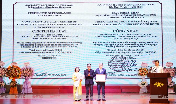 Ông Đinh Công Bắc – Phó Giám đốc Trung tâm Kiểm định chất lượng CATD – Hiệp hội Cao đẳng Cộng đồng Việt Nam trao Giấy chứng nhận Đạt tiêu chuẩn KĐCL chương trình đào tạo ngành Tiếng Hàn Quốc cho Khoa Ngôn ngữ Nhật Bản – Hàn Quốc