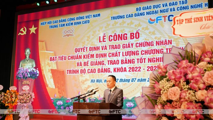 Sau phần Công bố Quyết định, ông Đinh Công Bắc – Phó Giám đốc Trung tâm Kiểm định CATD đã lần lượt Trao Giấy chứng nhận đạt tiêu chuẩn kiểm định chất lượng chương trình đào tạo Tiếng Trung Quốc, Tiếng Hàn Quốc, Công nghệ kỹ thuật ô tô trình độ cao đẳng cho Nhà trường. Phát biểu chúc mừng Nhà trường, ông Đinh Công Bắc nhấn mạnh: “Kết quả hôm nay là minh chứng cho tư duy chiến lược của lãnh đạo Nhà trường trong việc khẳng định chất lượng GDNN. Chất lượng GDNN là then chốt của sự nghiệp giáo dục nói chung và của Trường Cao đẳng Ngoại ngữ và Công nghệ Hà Nội nói riêng. Chúc Nhà trường không ngừng duy trì, cải tiến để nâng cao chất lượng GDNN, thực hiện tốt sứ mệnh cung cấp nguồn nhân lực chất lượng cao phục vụ cho việc phát triển của đất nước”.
