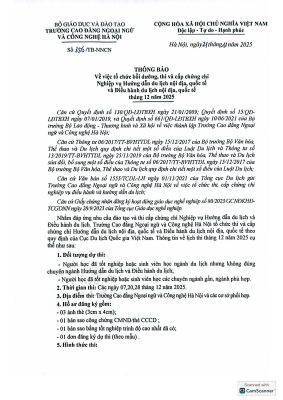Tuyển sinh Thông báo lịch Bồi dưỡng, thi và cấp chứng chỉ Nghiệp vụ HDDL, ĐHDL Nội địa và Quốc tế (Đợt thi Tháng 12/2025) Posted on Tháng 12 8, 2025 by khoadulich Khoa Du lịch – Dịch vụ đồng hành cùng chương trình kỷ niệm 20 năm thành lập Khoa Quản lý Giáo dục – Trường Đại học Sư phạm Hà Nội .
